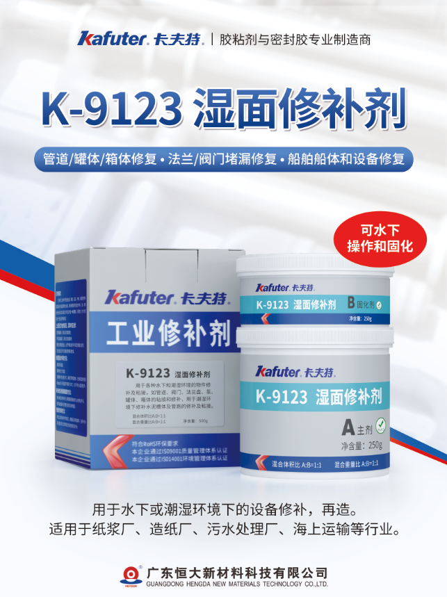 在暴雨傾盆的工廠車間、海水侵蝕的船艙管道,甚至是水下作業的關鍵設備中,設備滲漏與破損往往意味著高額停機損失和安全風險。傳統修補方案在潮濕環境下的性能衰減、施工復雜等問題,卡夫特K-9123 濕面修補劑以它無需表面干燥,直面水汽甚至浸水工況的優點,為工業維修領域提供了更便捷地修補解決方案。